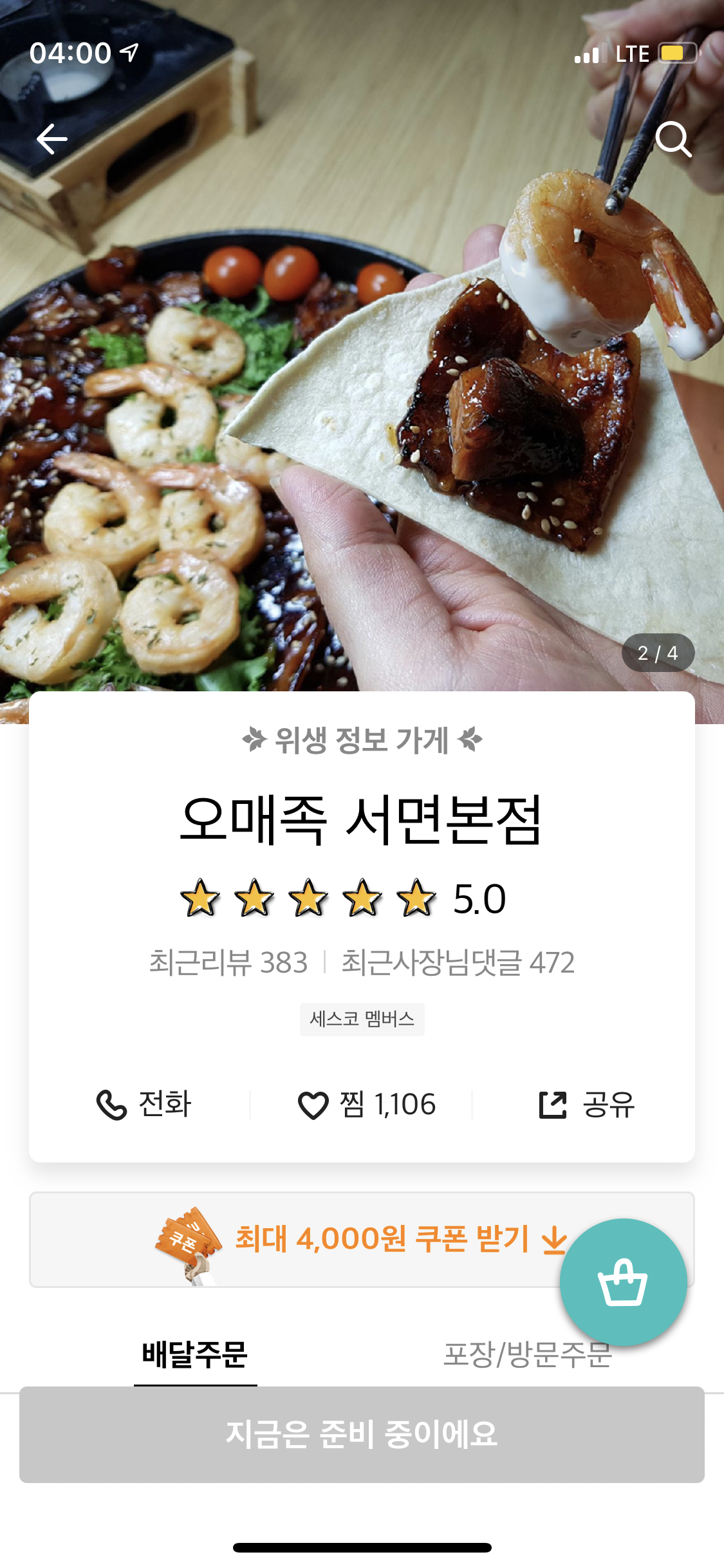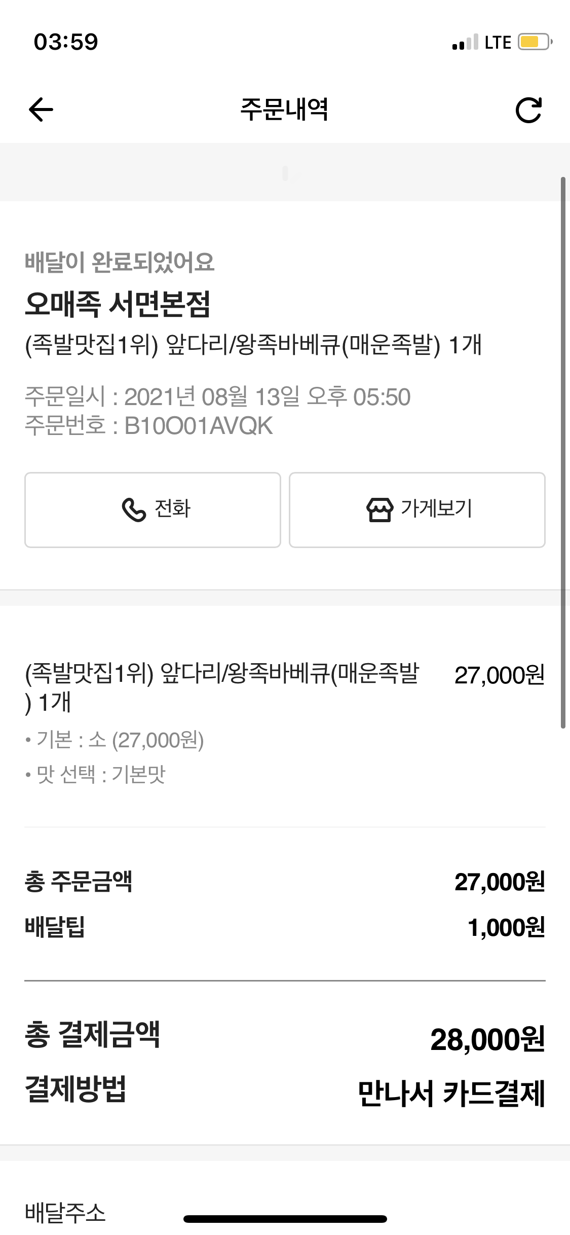 배달의민족을 통해서 오매족 서면본점에서 주문하였습니다.