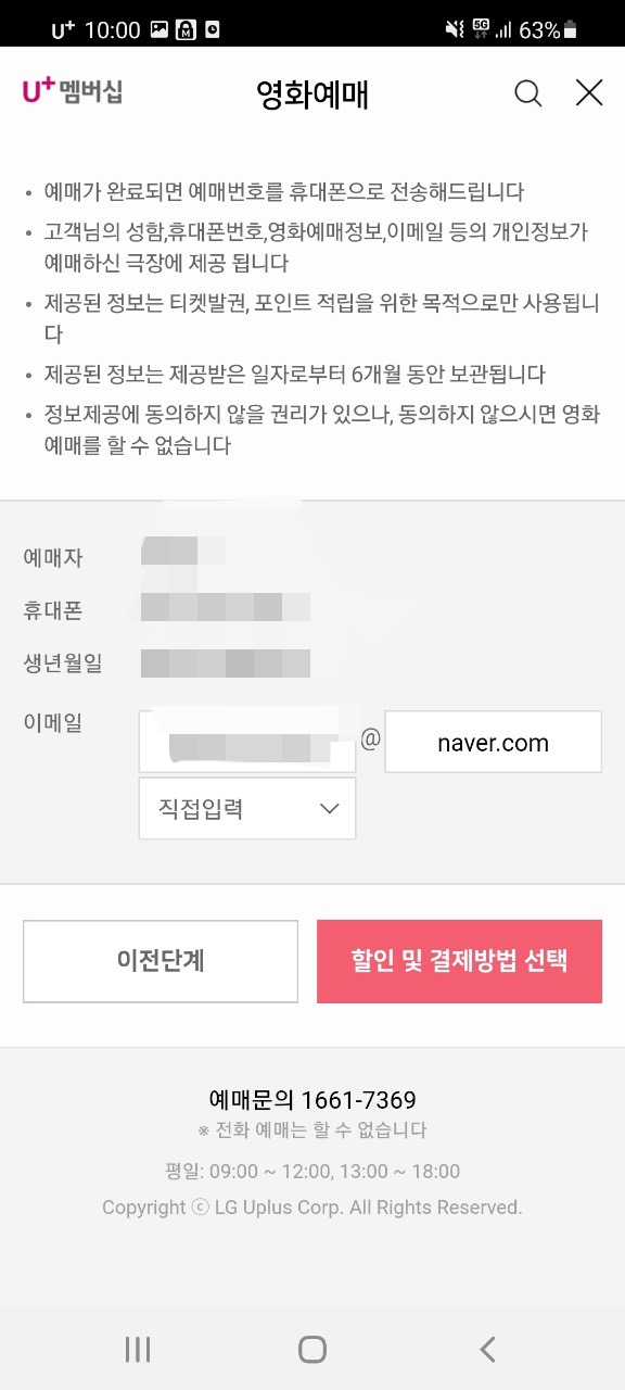 예매자 인적사항 확인 후 할인 및 결제방법 선택을 눌러주세요.
