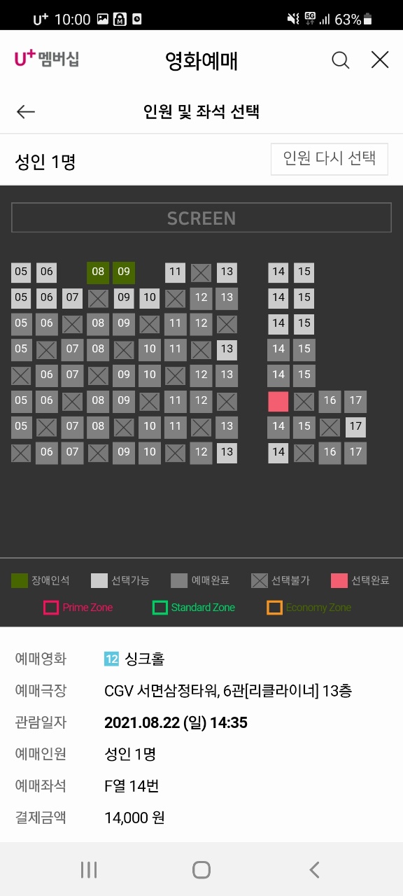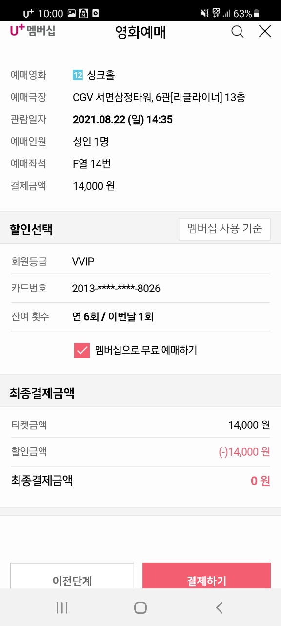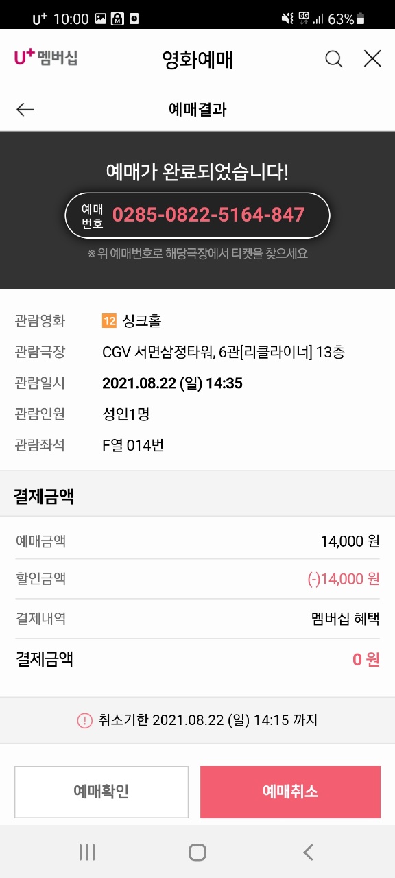 예매금액 14,000원 - 할인금액 14,000원 = 결제금액 0원