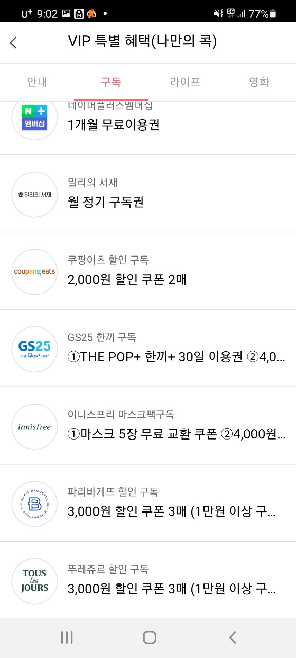 저는 영화콕을 선택해서 한 달에 한 번 영화 공짜로 보고 있어요 ㅎㅎ