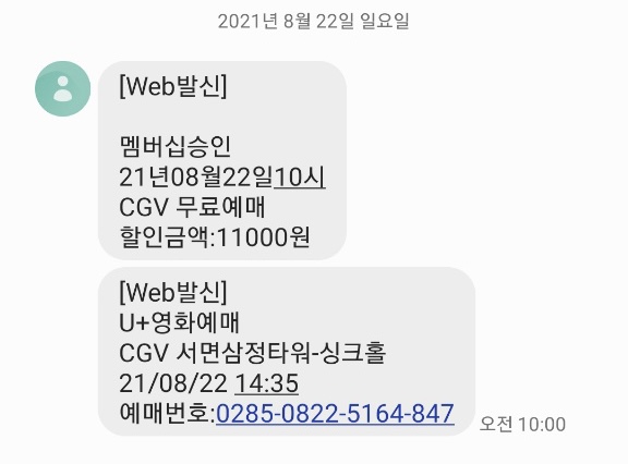 예매하면 문자로도 예매내역, 예매번호를 보내주더라구요.
