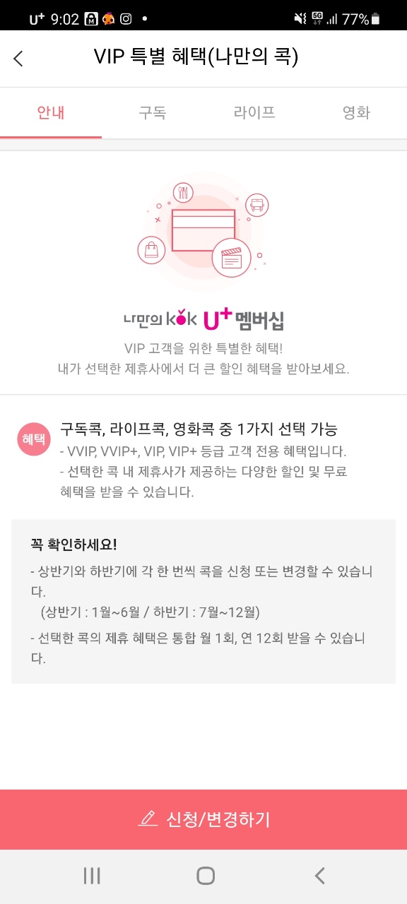 LG U+ VIP 이상 고객분들은 구독콕, 라이프콕, 영화콕 중 1가지 선택해서 매달 혜택을 누리실 수 있어요.