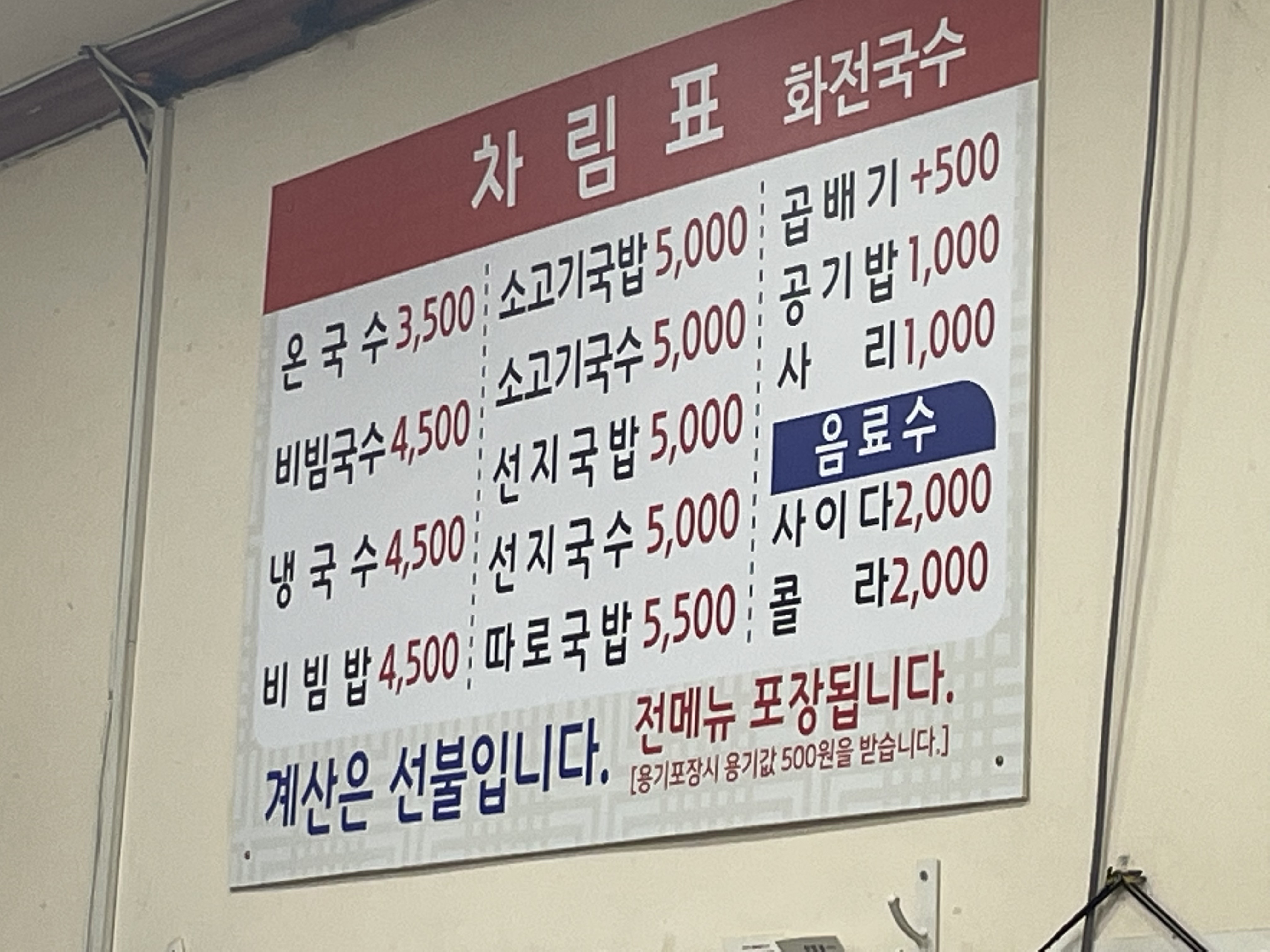 5년전쯤에는 온국수 2,000원, 소고기 국밥, 국수가 3,500원 정도 했던 것 같은데