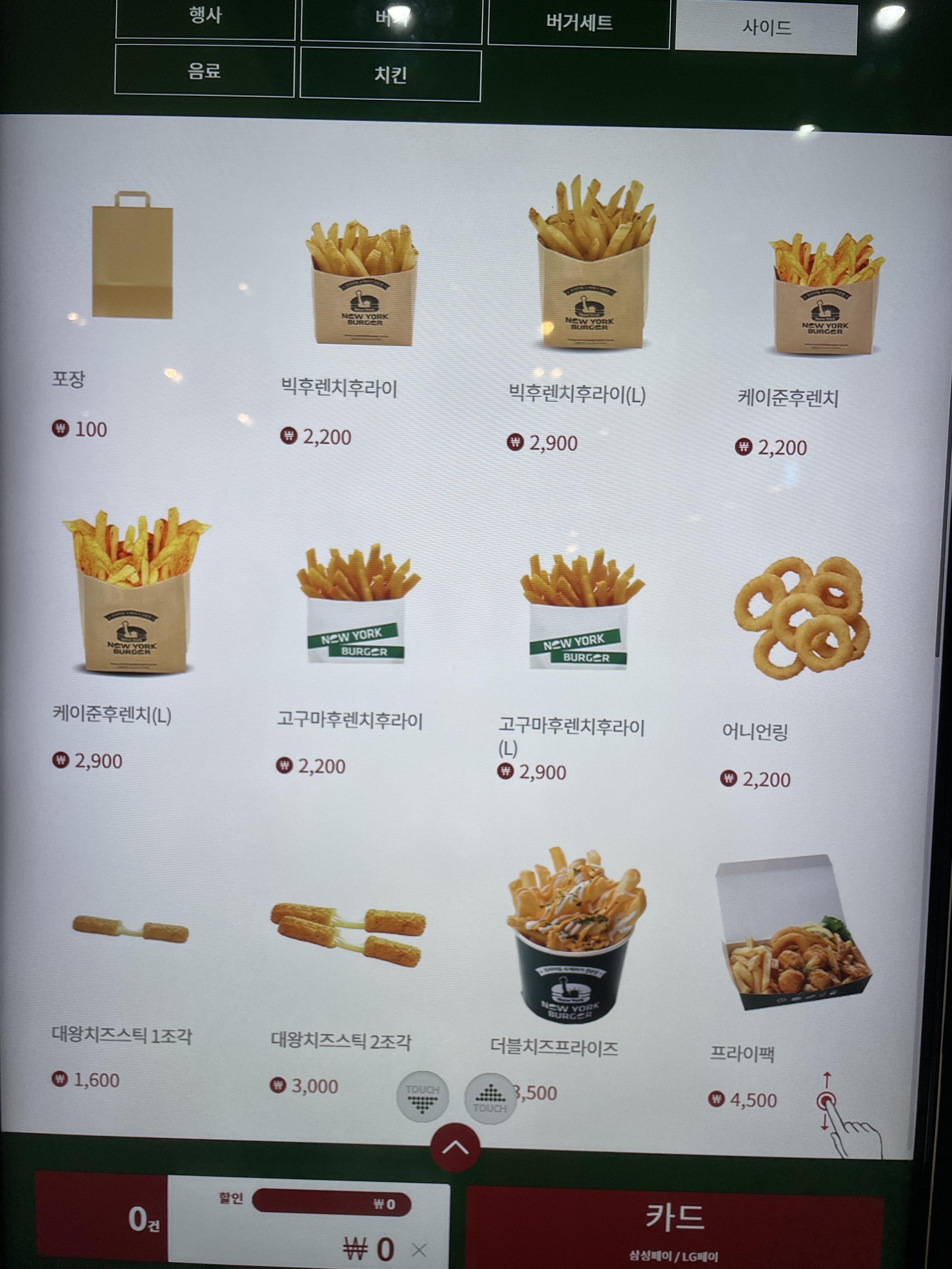 사이드메뉴로는 감자튀김뿐만 아니라 어니언링, 고구마튀김, 치즈스틱, 오징어스틱, 텐더, 스콘, 치킨 등 여러가지 메뉴가 있어 선택의 폭이 넓어서 좋네요.