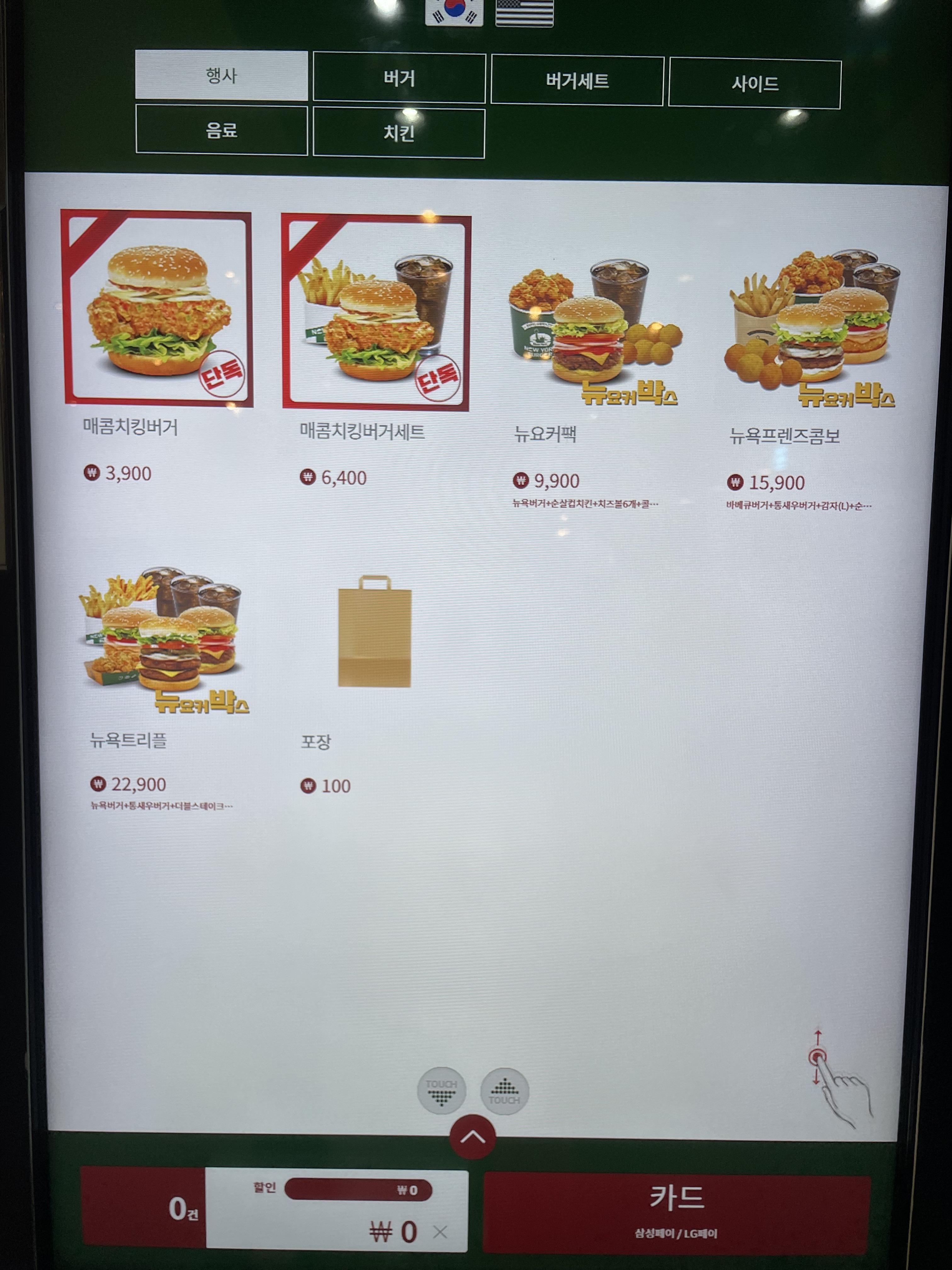 행사상품으로 매콤치킹버거(세트), 뉴요커팩, 뉴욕프렌즈콤보, 뉴욕트리플이 있네요