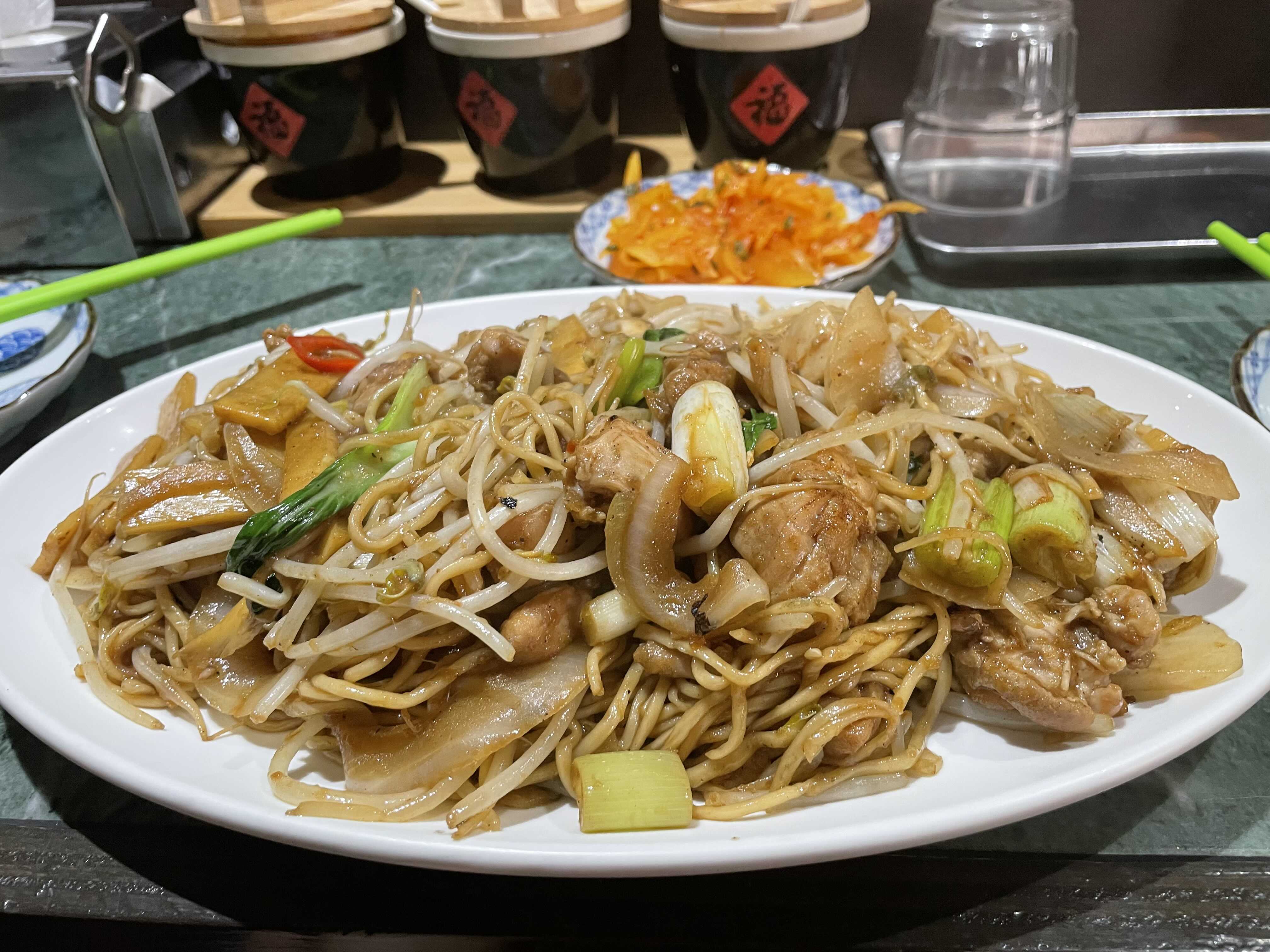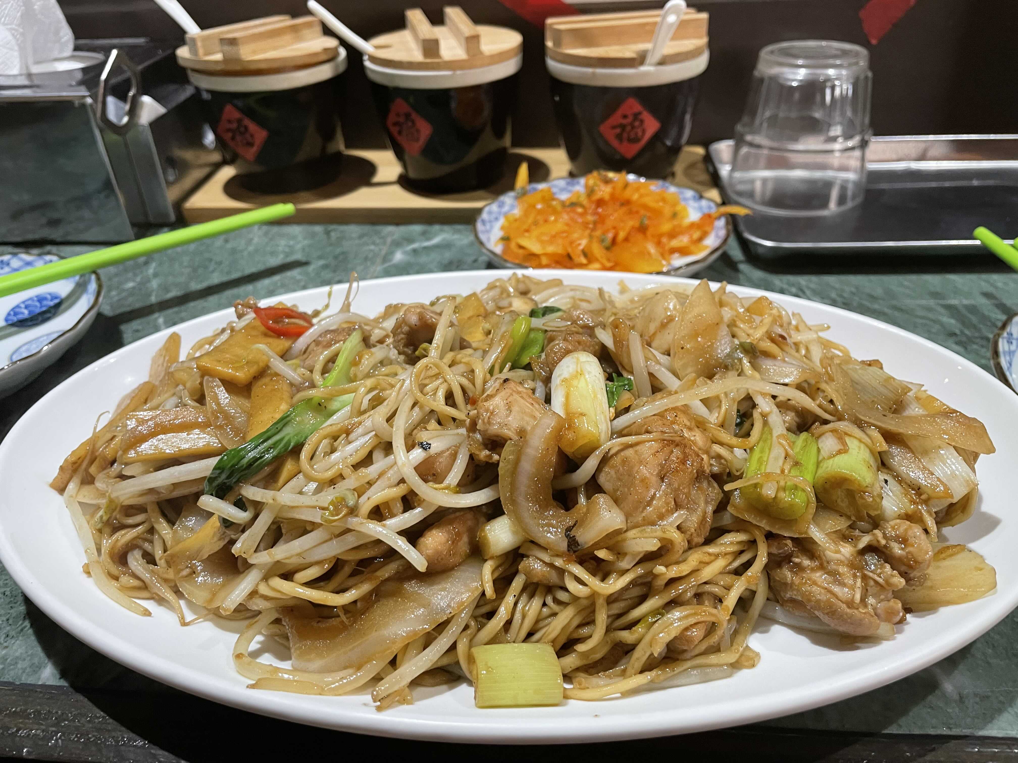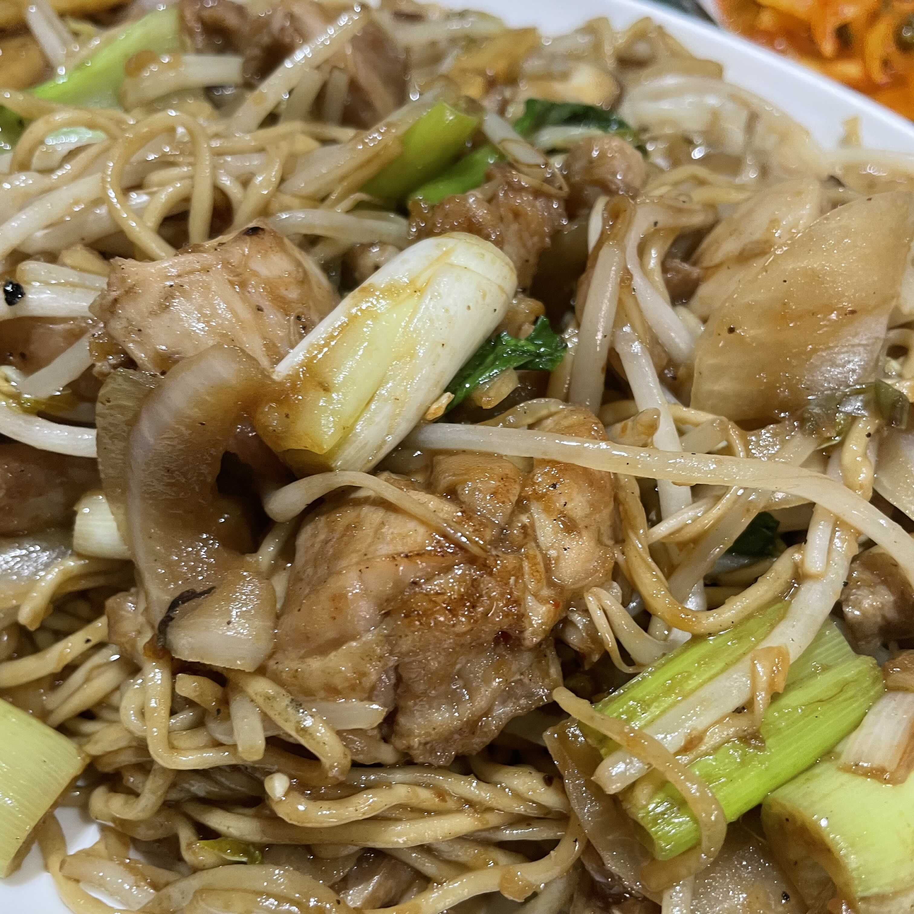 차오멘은 닭고기, 양파, 숙주, 대파, 청경채, 죽순과 함께 면을 볶은 요리입니다.