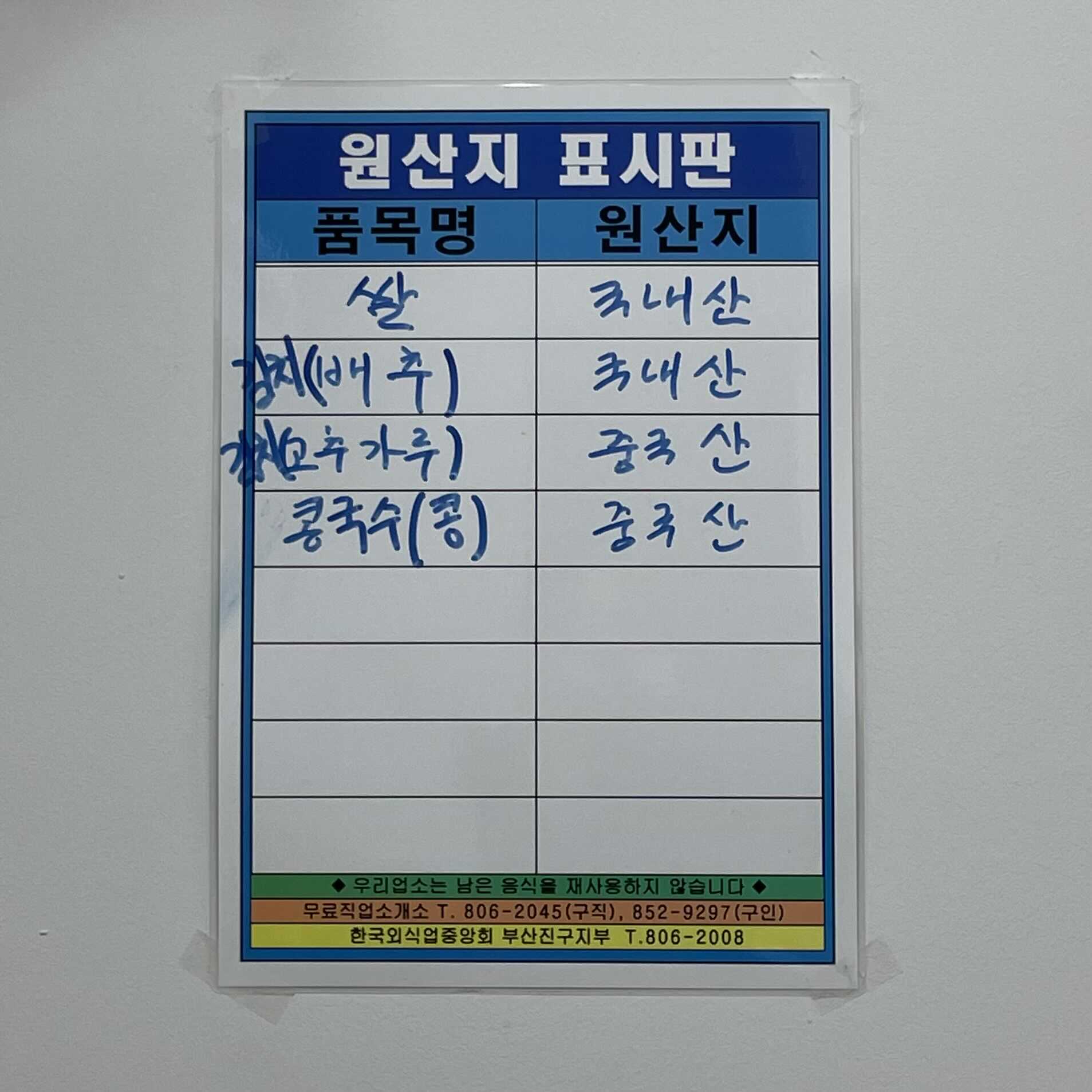 부부 손칼국수 원산지 표시