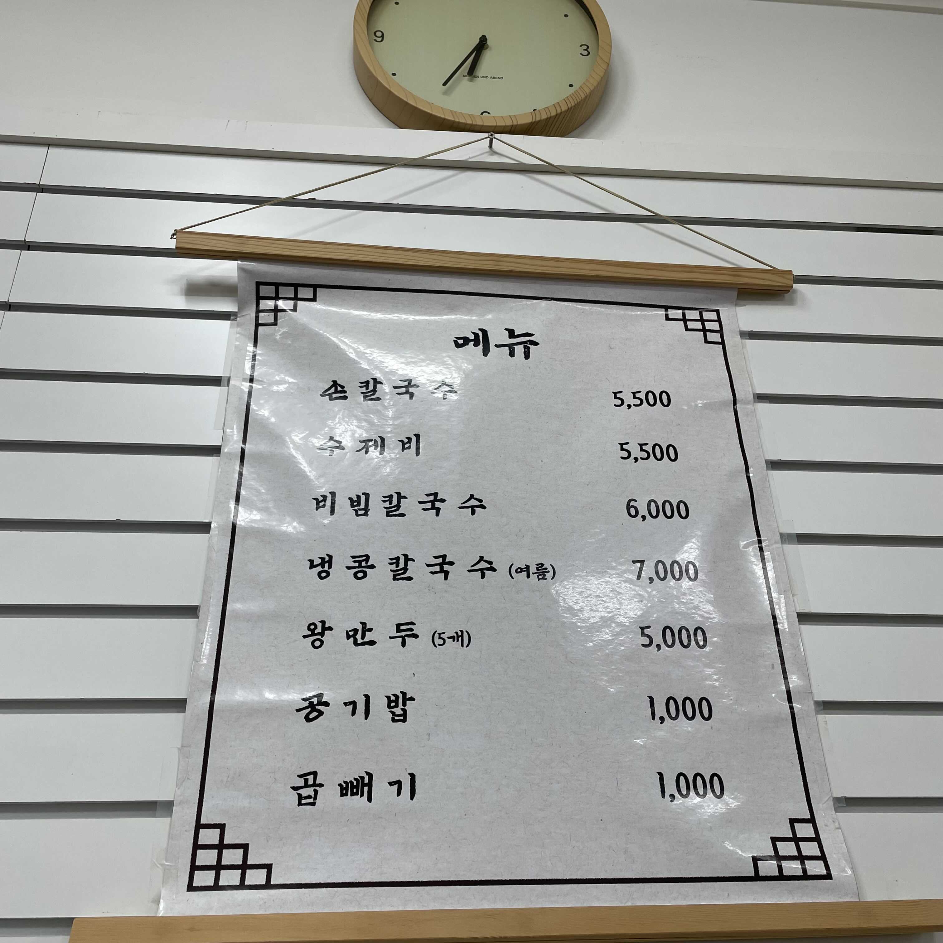 손칼국수, 수제비, 비빔 칼국수, 냉콩칼국수 (여름 한정 메뉴), 왕만두 (5개), 공기밥, 곱빼기는 천 원 추가입니다.