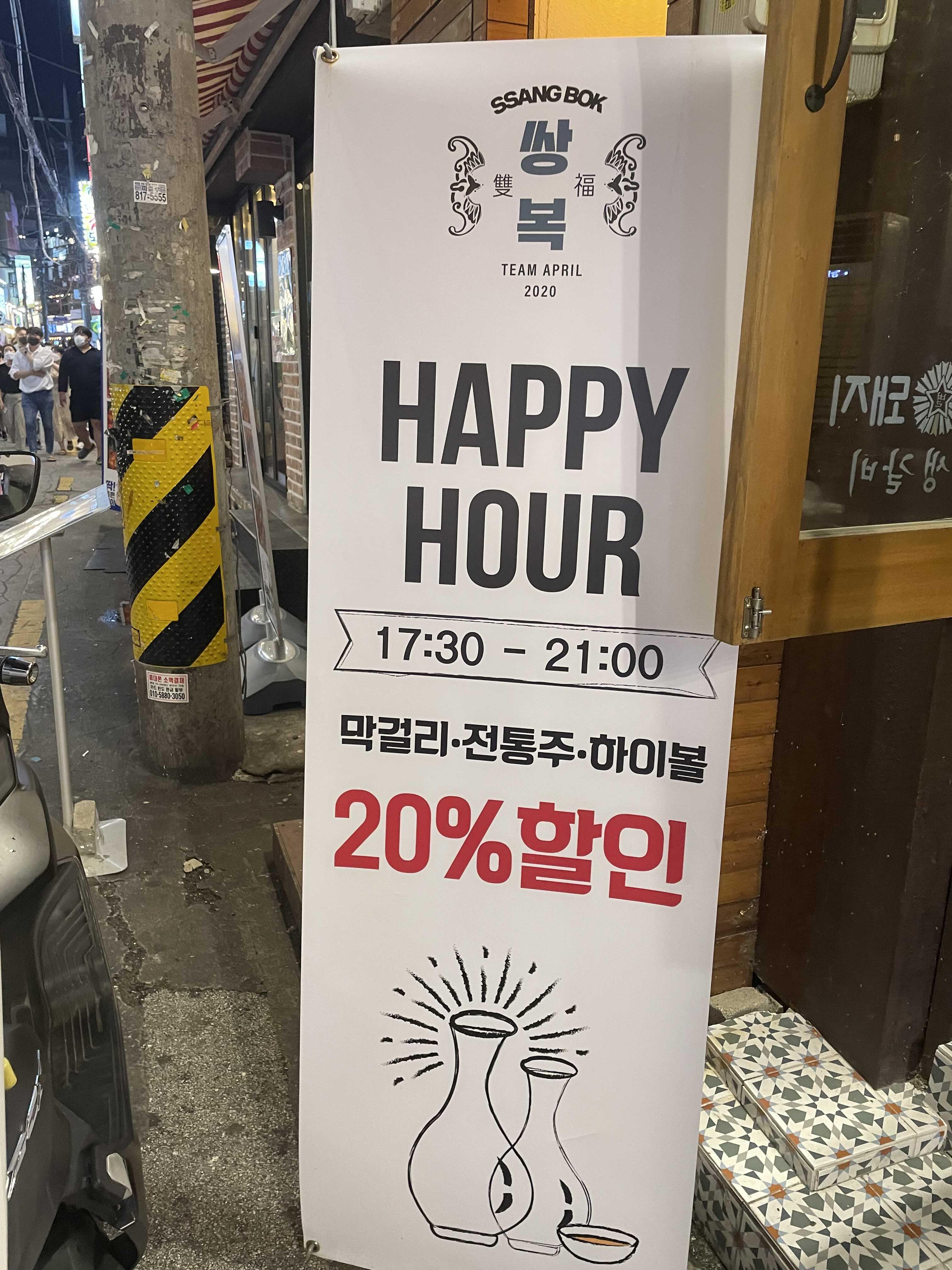 서면 쌍복은 해피 아워 17:30-21:00 막걸리, 전동주, 하이볼 한정 20% 할인을 해줍니다.