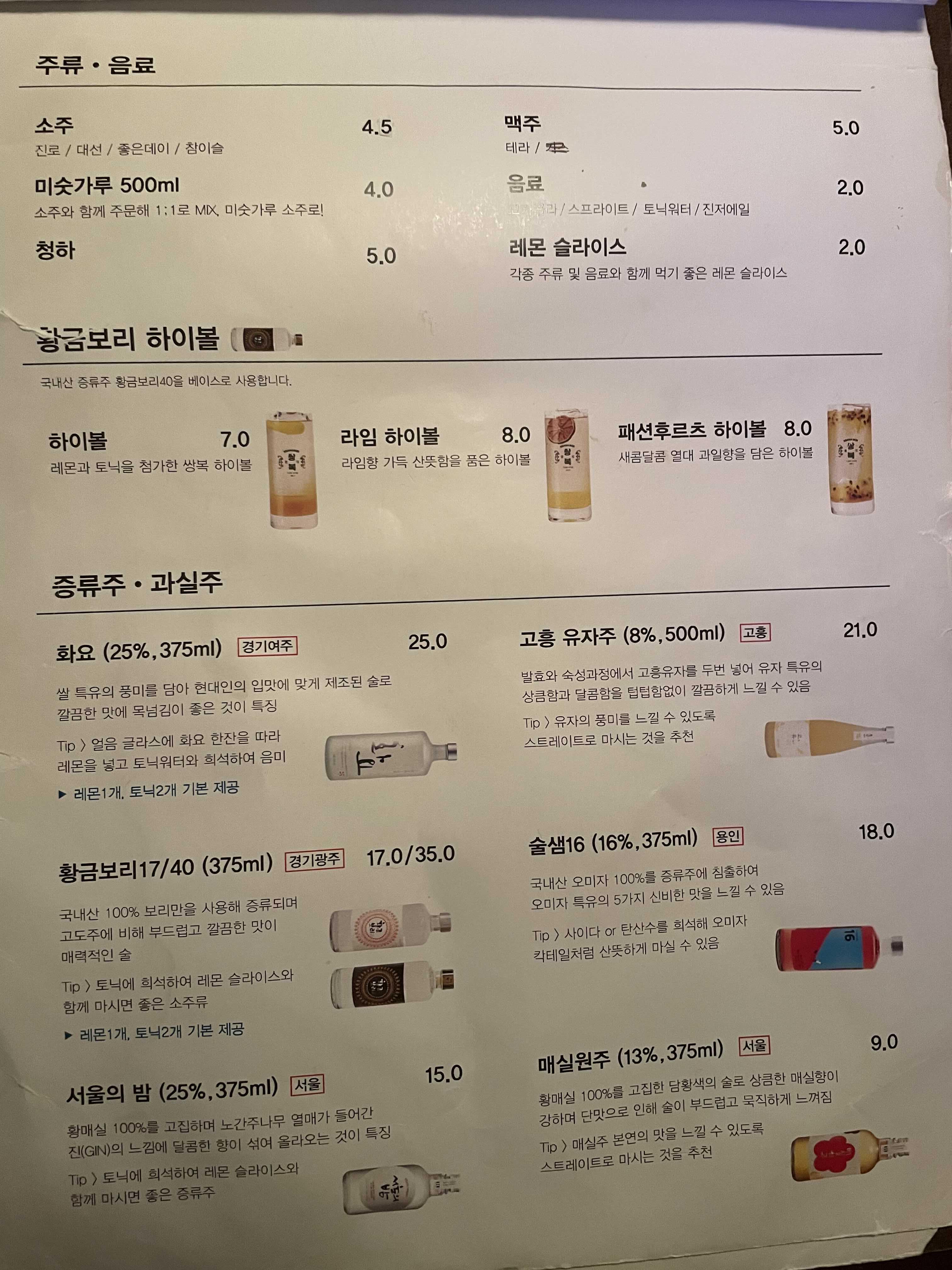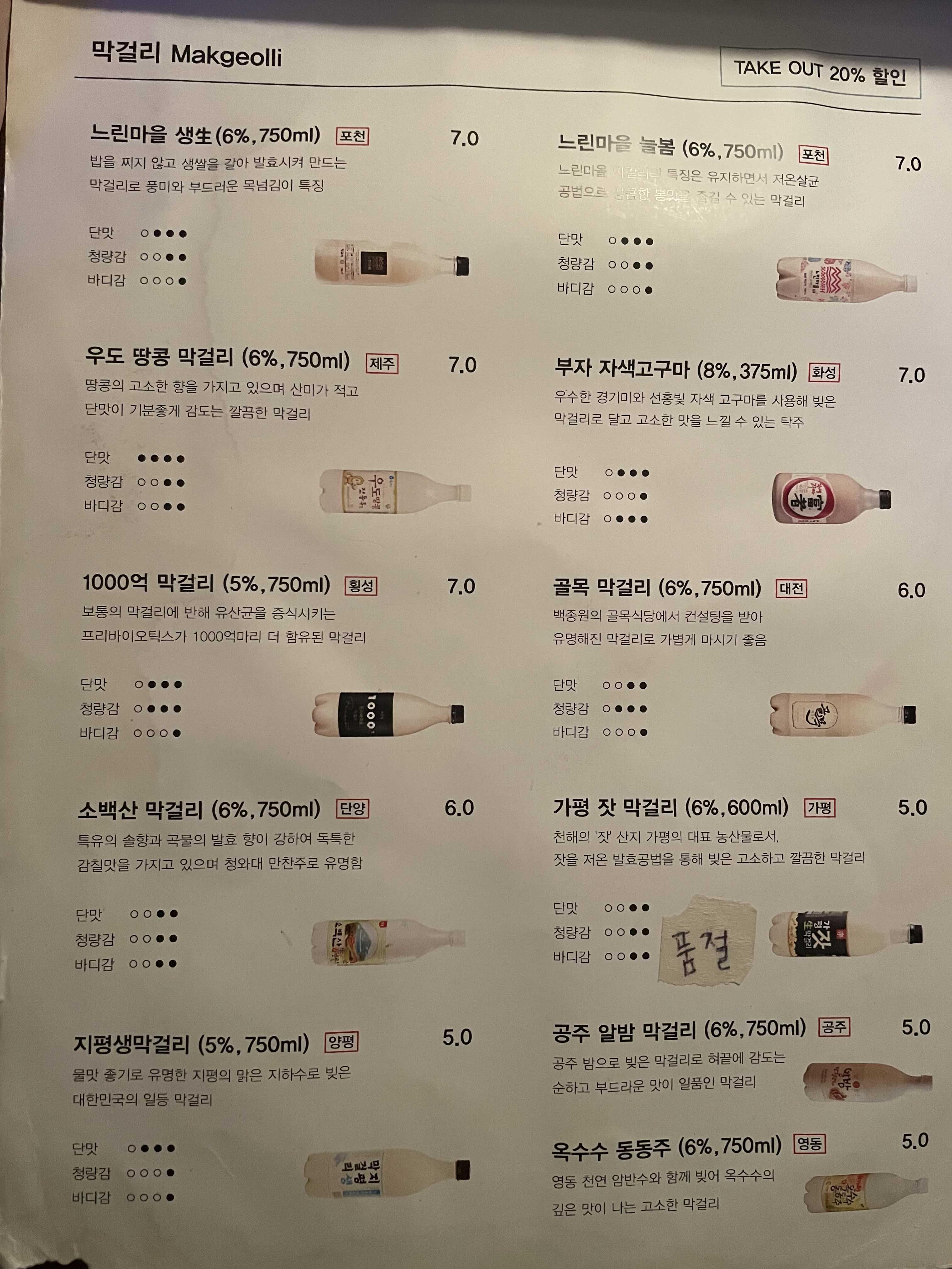 제가 방문했을 당시에는 가평 잣 막걸리, 옥수수 동동주, 공주 알밤 막걸리 품절이였어요.