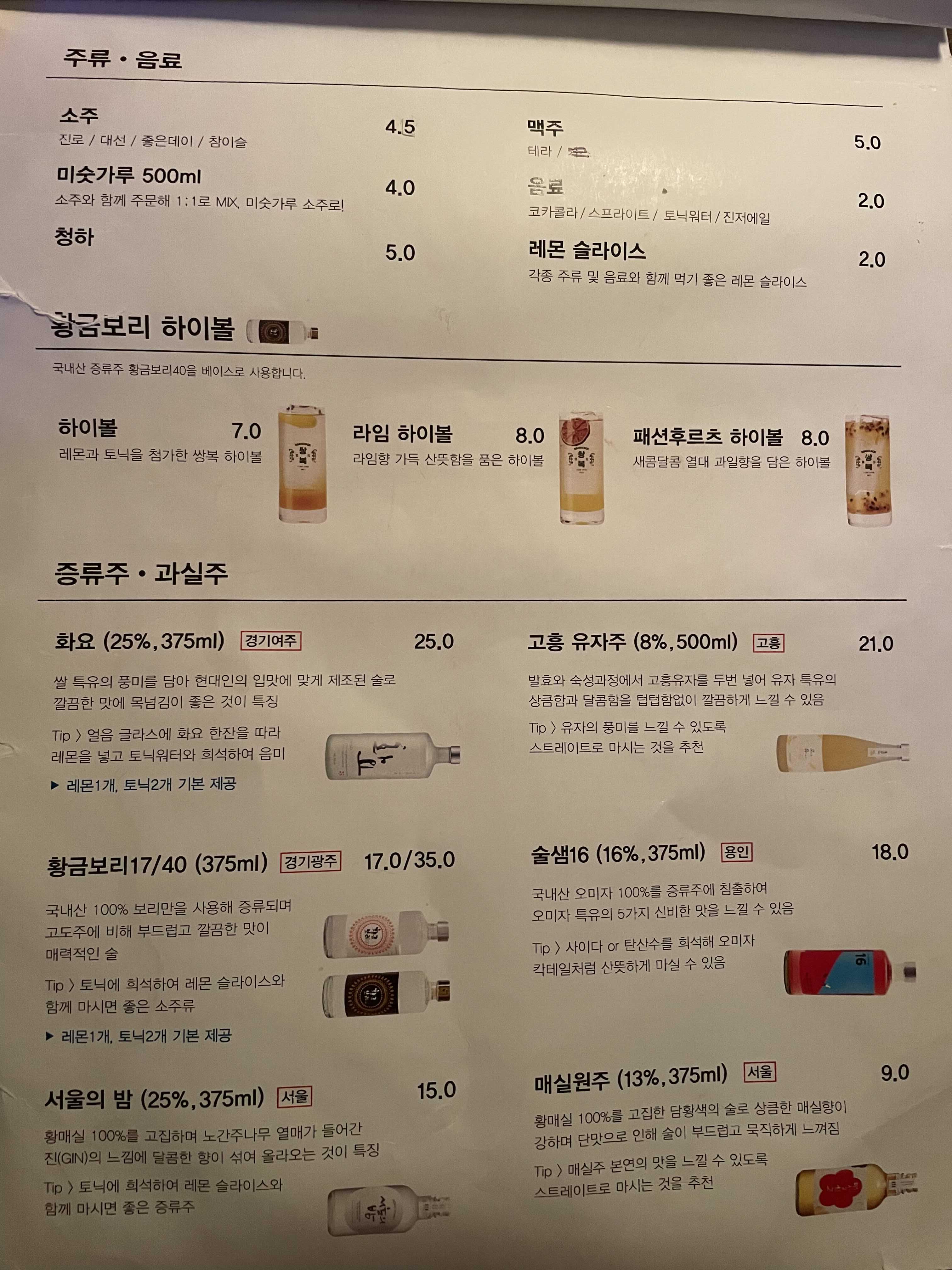 막걸리, 전통주가 아무래도 소주, 맥주보다는 가격대가 있어서 가격적으로 부담스러울 수 있는데 쌍복은 해피아워에 20% 할인된 가격으로 이용할 수 있어서 좋더라구요.