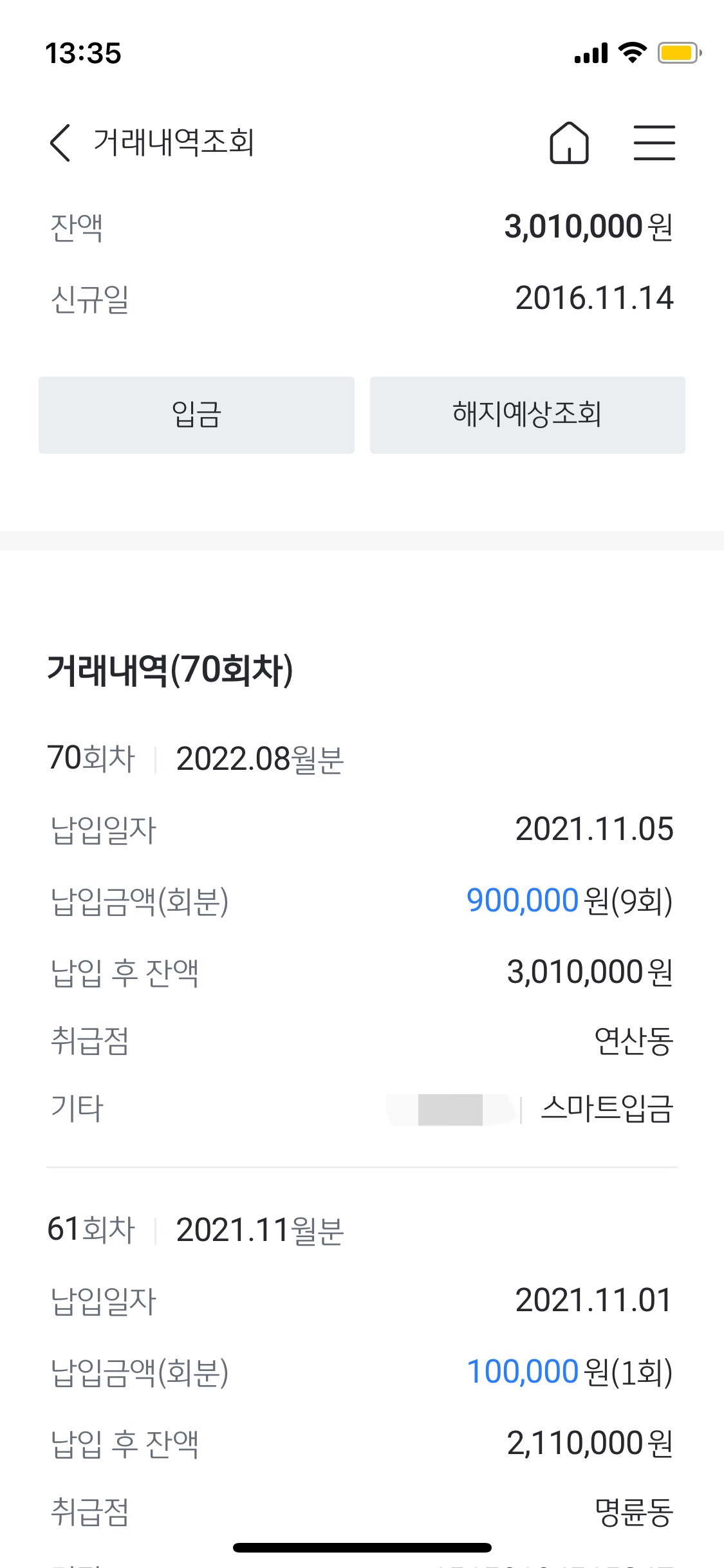 그러면 이렇게 총 납입 금액, 가입일, 납입 회차 확인이 가능한데요.