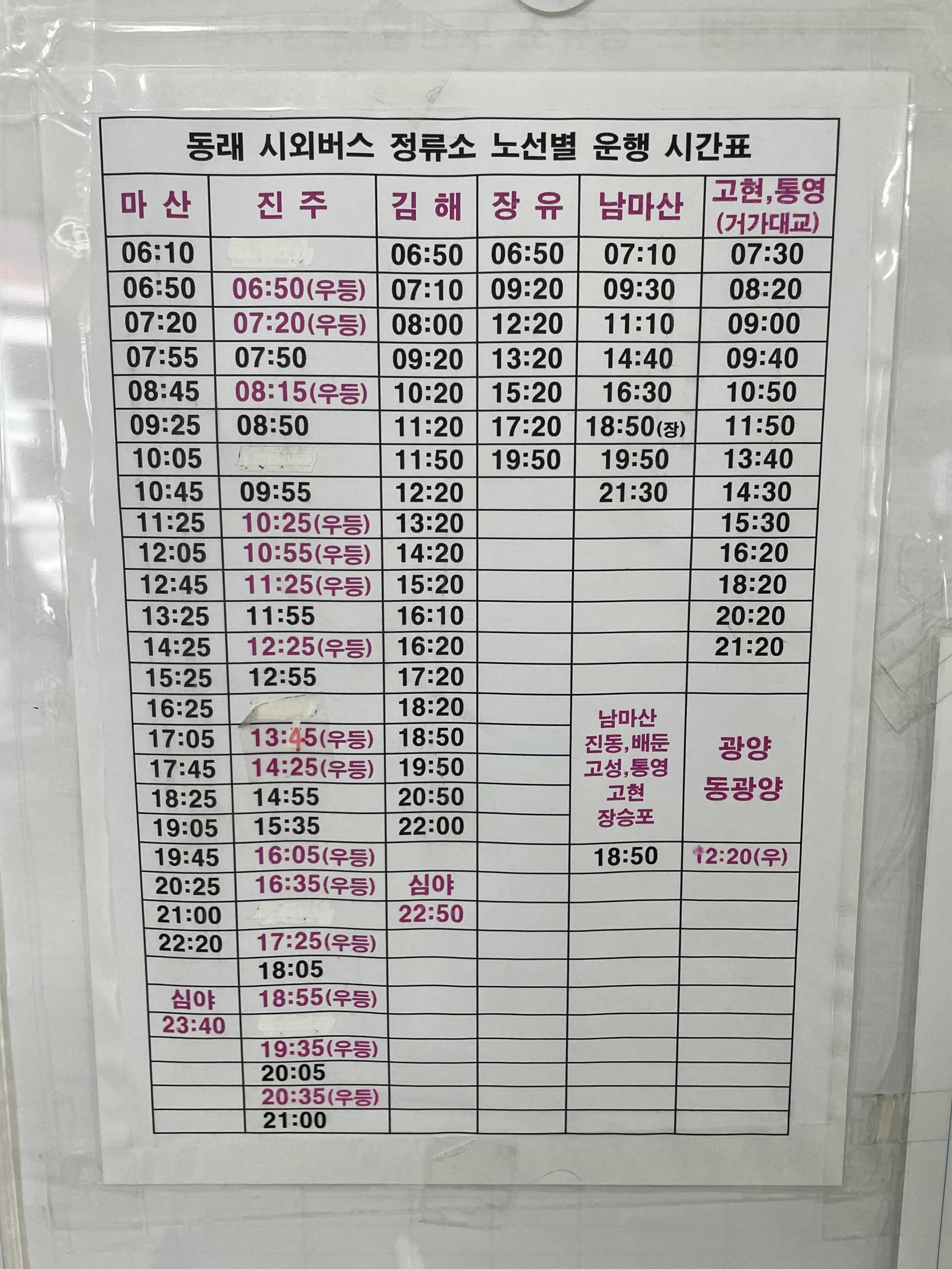 창원, 창원(심야), 마산, 마산(심야), 진주, 김해, 김해(심야), 장유, 고현, 통영, 남마산, 진동, 배둔, 고성, 통영, 고현, 장승포, 광양, 동광양 운행시간표