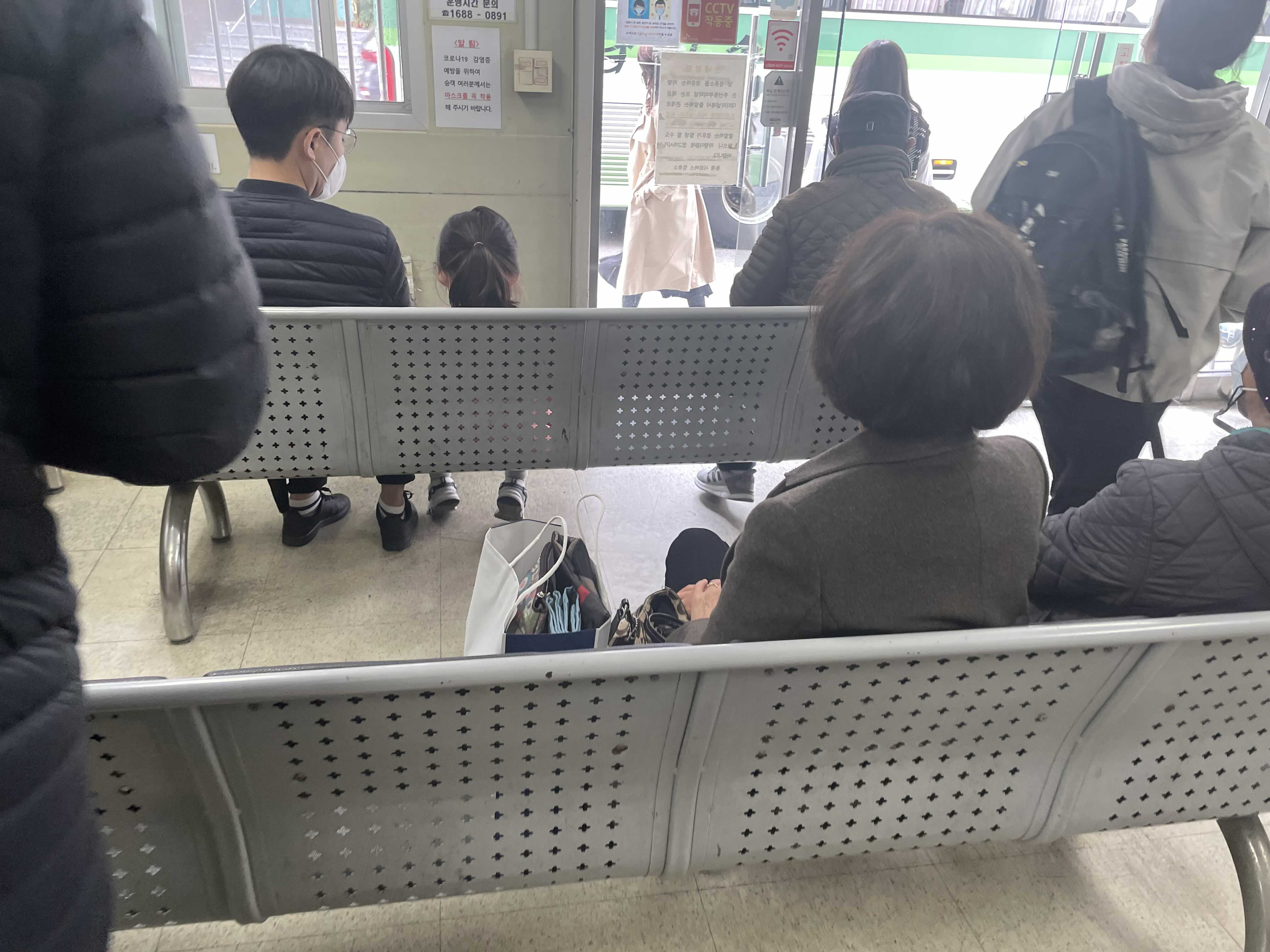 저기 끝에 보이는 의자에 버스가 도착하면 목적지 지역 이름 알려주시는 직원분이 앉아계십니다.