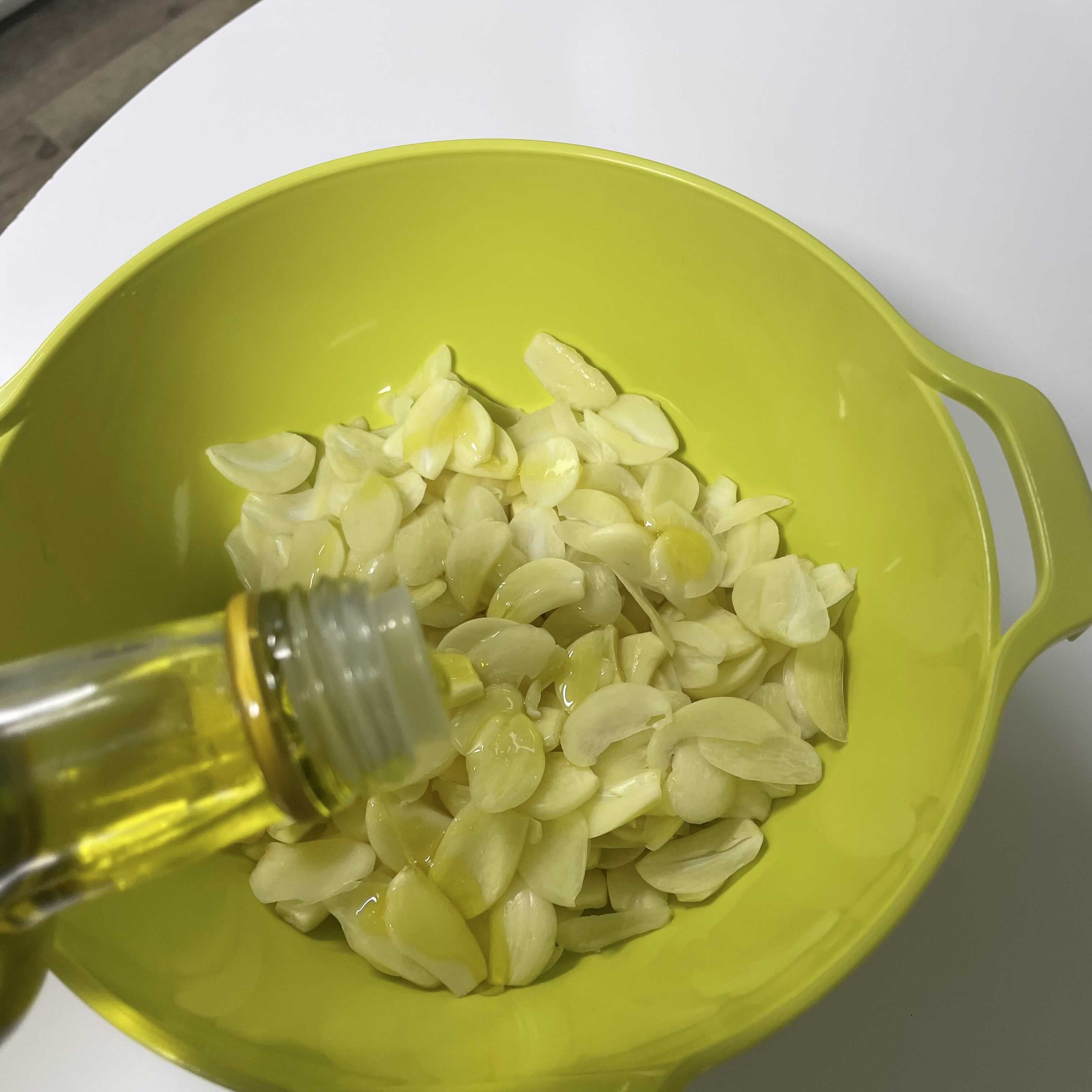 물기를 없앤 편마늘을 볼에 담아서 올리브오일 묻혀줍니다.