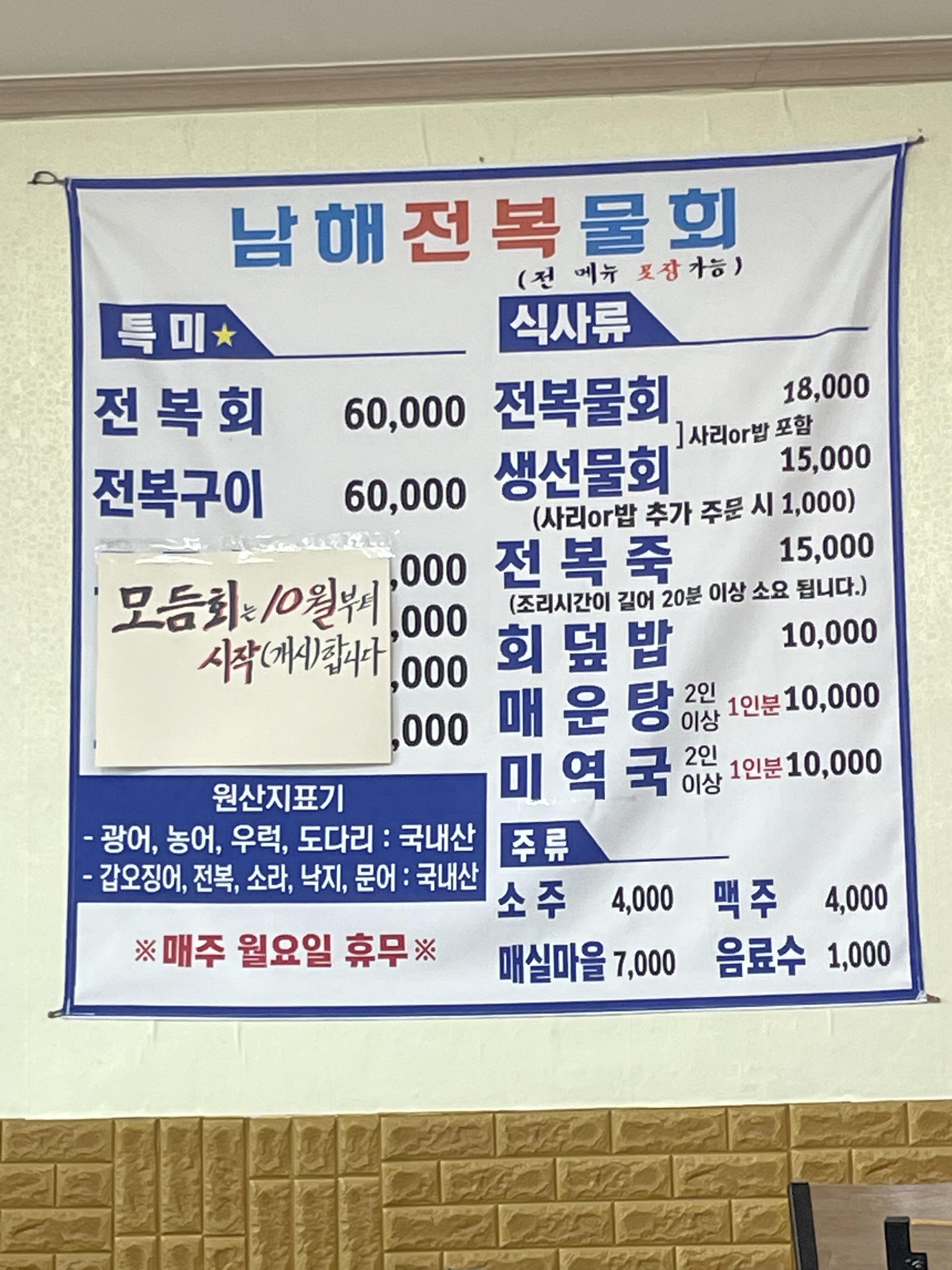 남해전복물회 메뉴입니다. 저희는 전복물회를 주문했습니다. 다음에는 전복죽도 먹어보고싶네요~